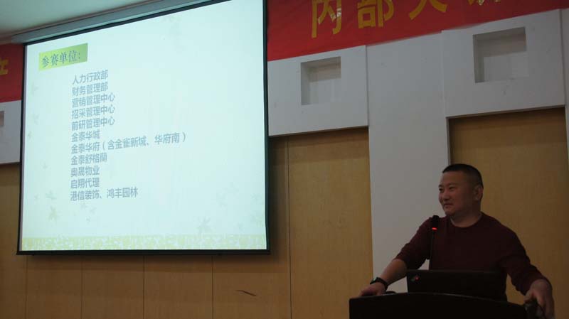 本屆活動(dòng)由運(yùn)營(yíng)管理中心組織。參賽單位由人力行政部、財(cái)務(wù)管理部、營(yíng)銷(xiāo)管理中心、招采管理中心、前研管理中心、金泰華城、金泰華府(含金雀新城、華府南)、金泰舒格蘭、奧晟物業(yè)、啟翔代理、港信裝飾、鴻豐園林11支代表隊(duì)組成。